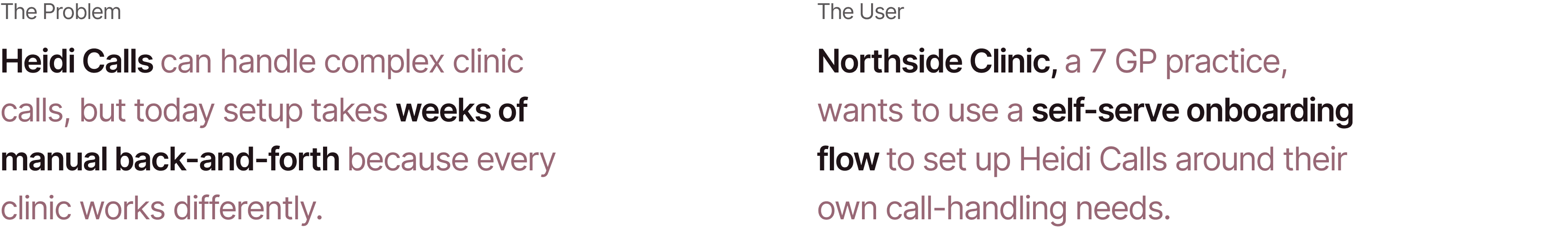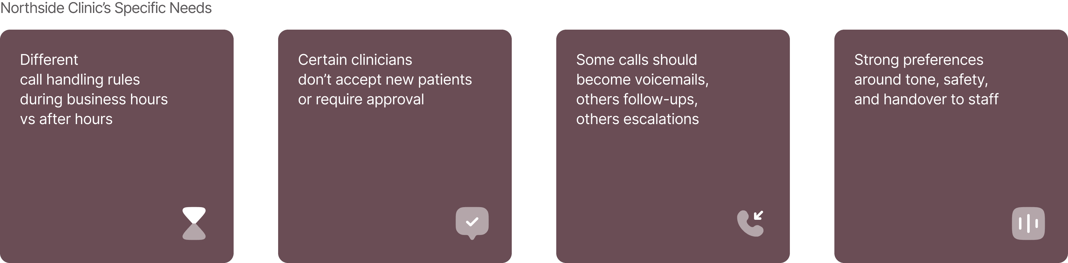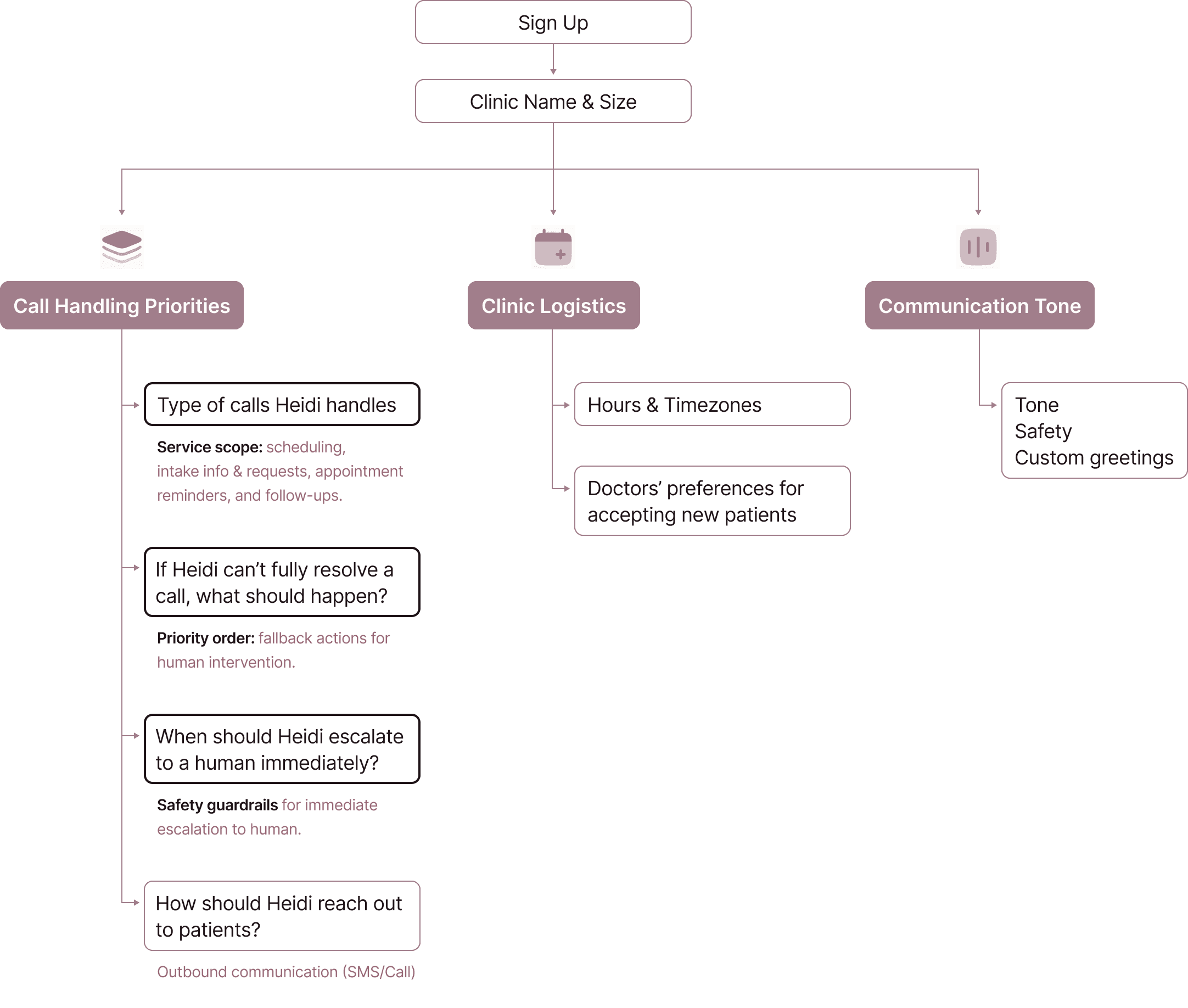 I designed the self-serve onboarding flow based on how front desk and administrative staff triage calls in practice. I decomposed Northside's operational needs for an automated call system and restructured the call setup into three tiers: call handling priorities, clinic logistics, and communication tone.